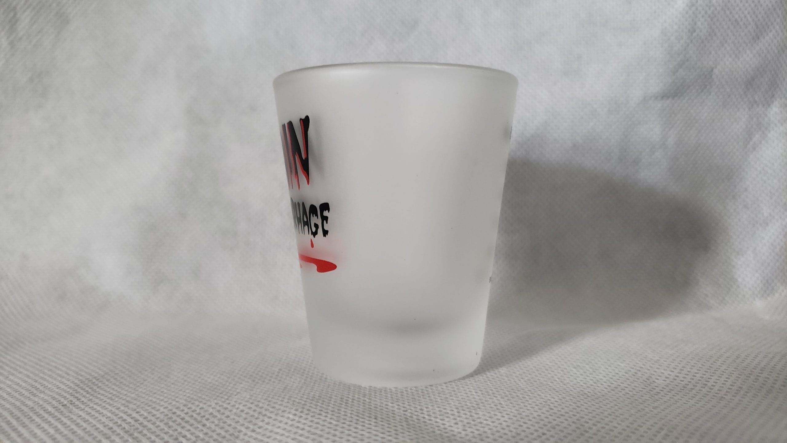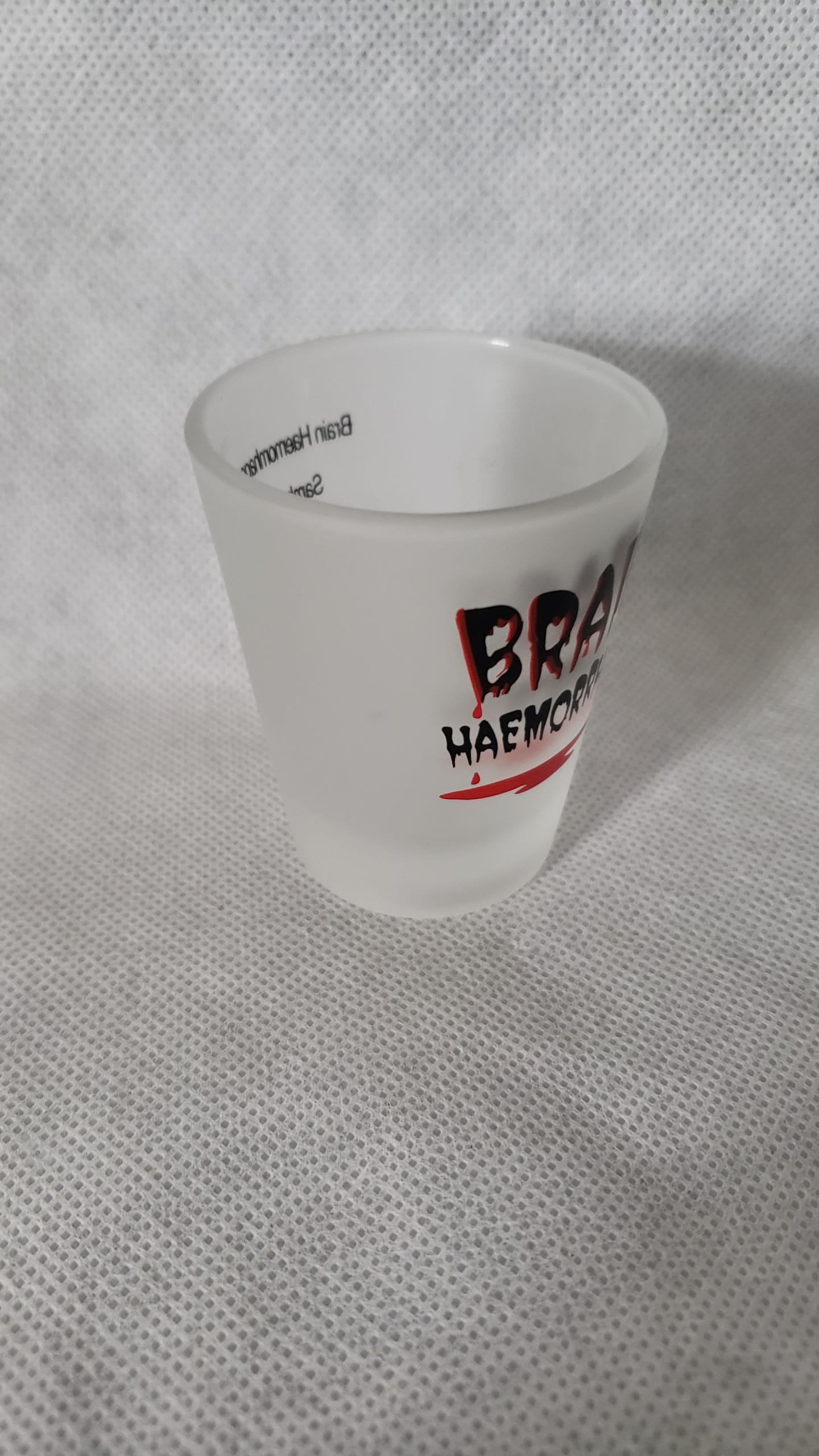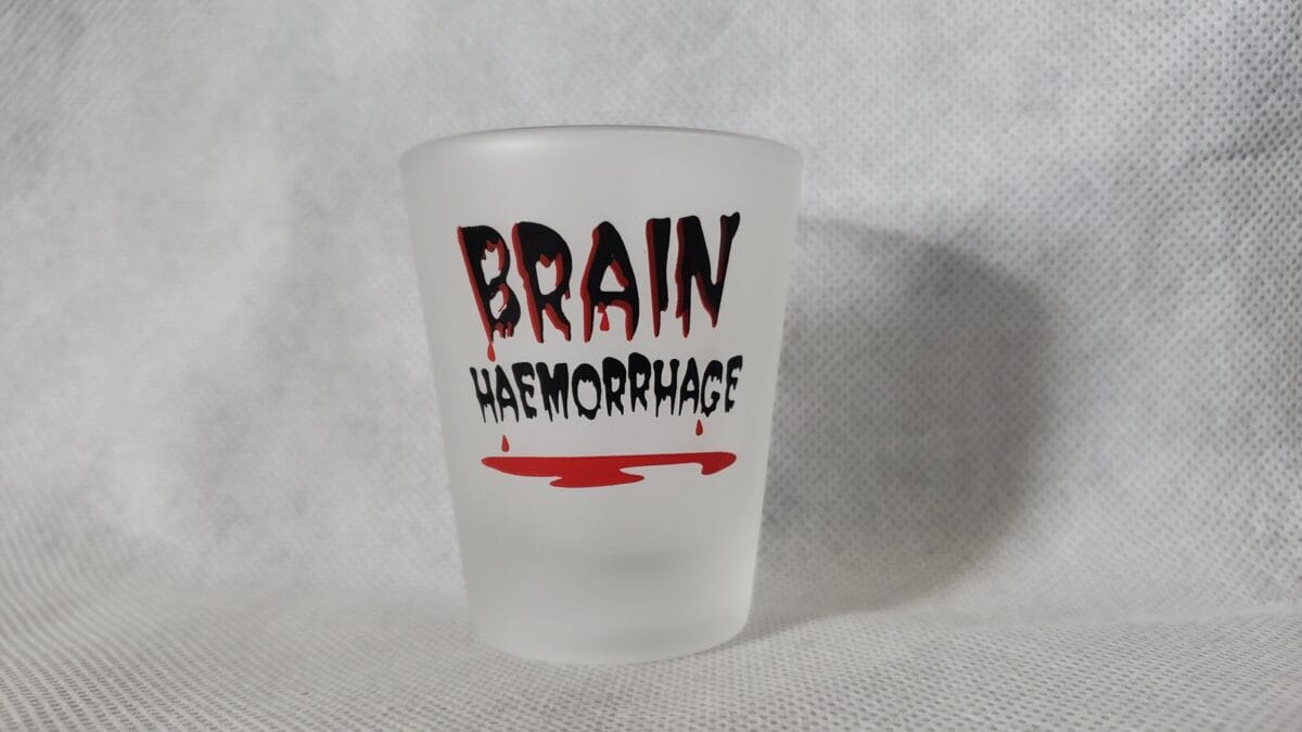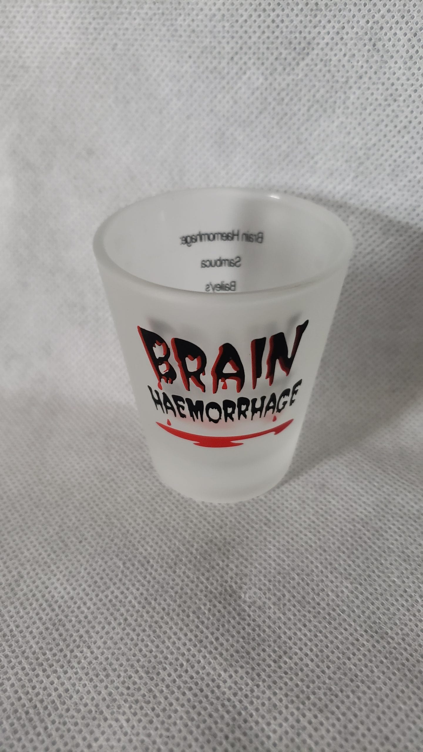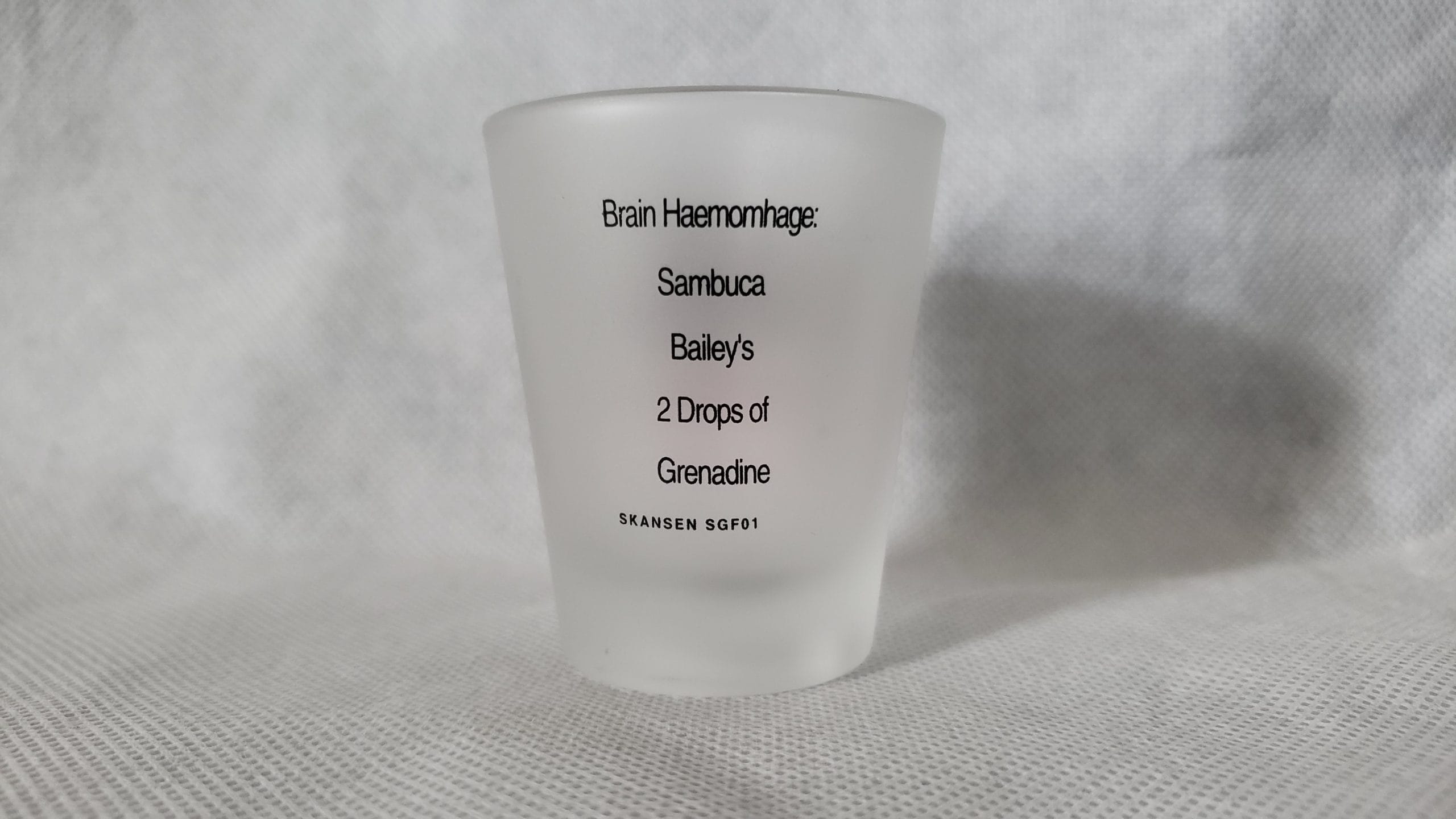 “Brain Haemorrhage” Frosted Whiskey Shot Glass with Recipe Printed on Back by Skansen Barware SGFG01