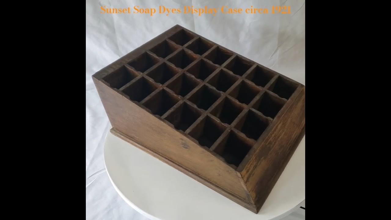 This vintage advertising display box was a wooden slant-front counter display rack titled “Sunset Soap Dyes” which displayed 24 compartments for Sunset Soap Dyes (Sunset Soap Dyes not included).