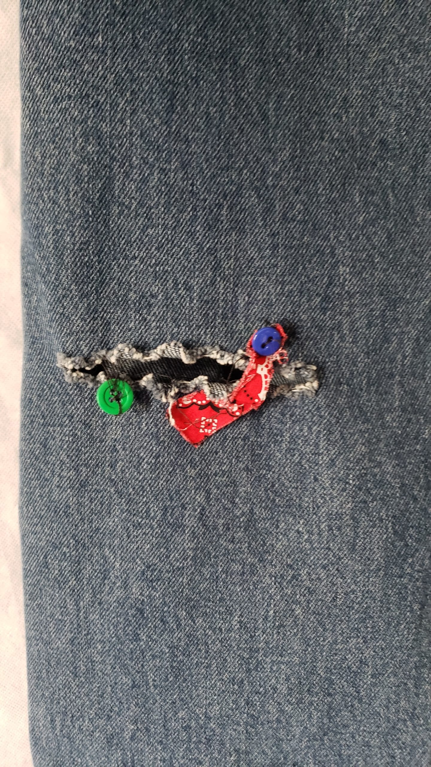 Accents: Safety pins, plastic loop belt, decorative patches, distressed throughout, detached/removed “Wrangler” designer tag, buttons, cut-outs.