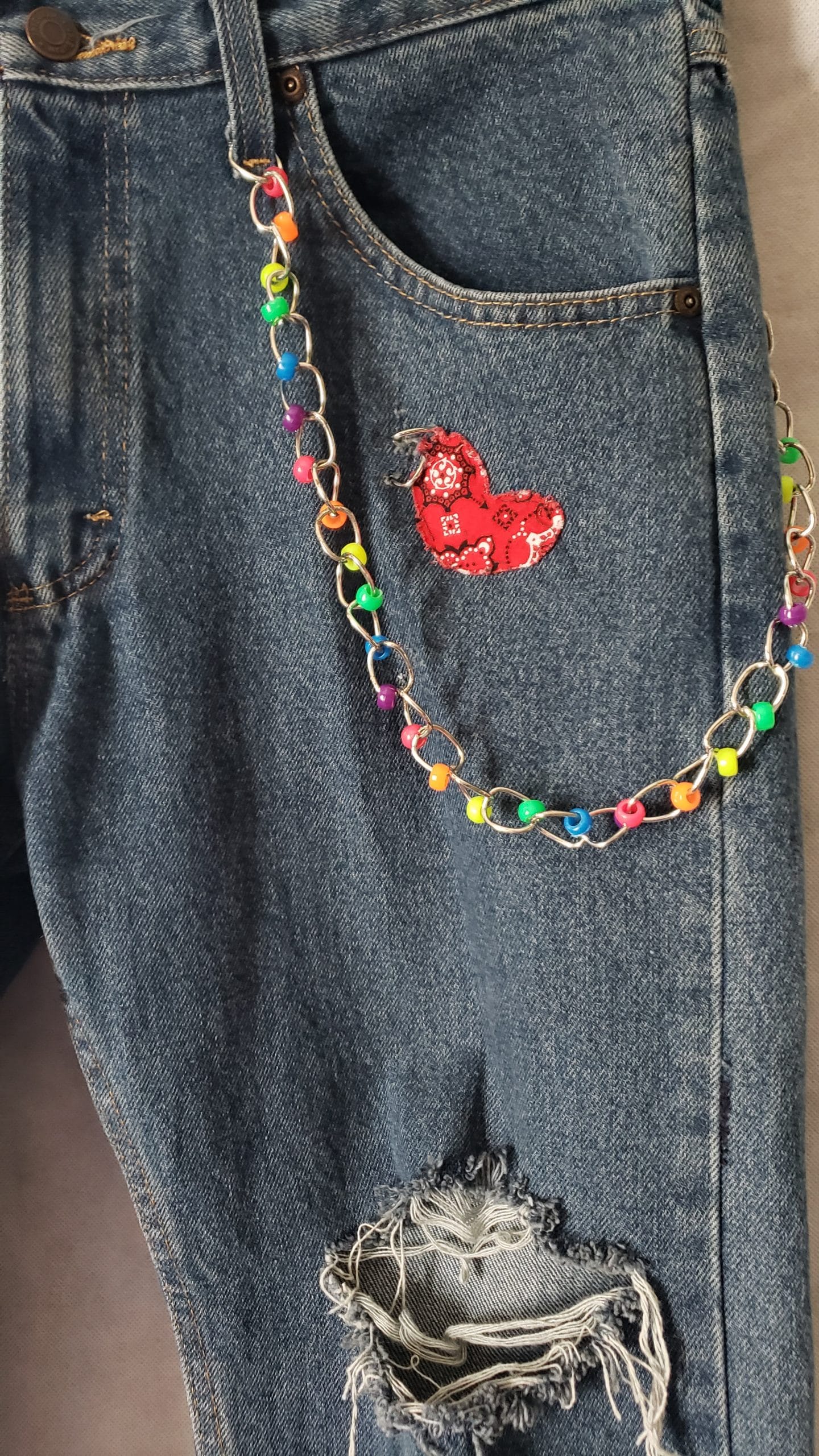 Multicolored Peace Logo /Sign / Symbol and Love Red Paisley Bandana Patched Wrangler Custom Designed Five Star Premium Patchwork Upcycled Boho Distressed Denim Jean Hippie Dark Stonewash