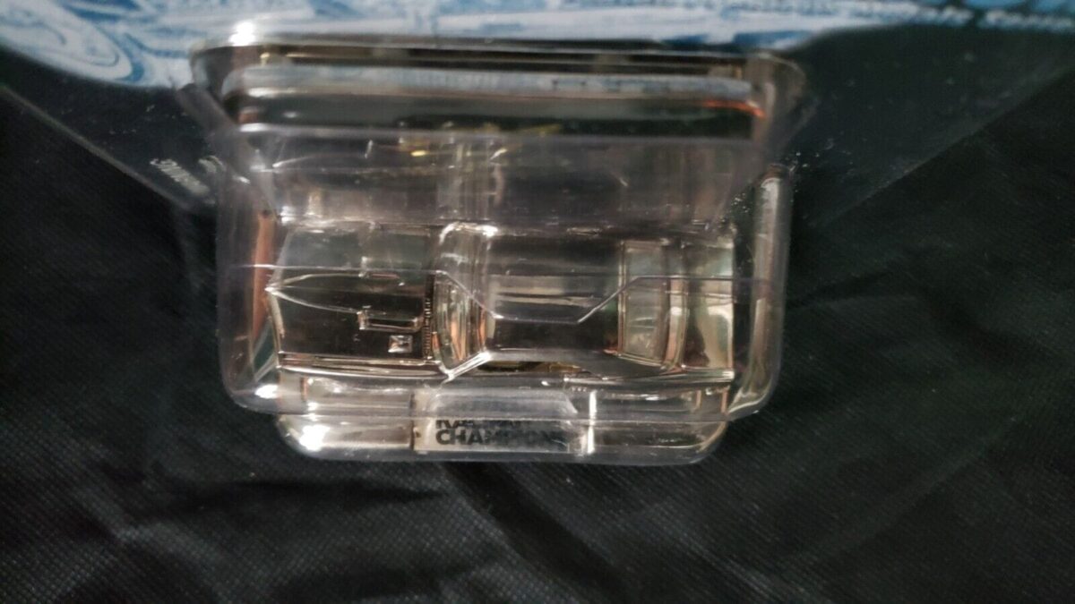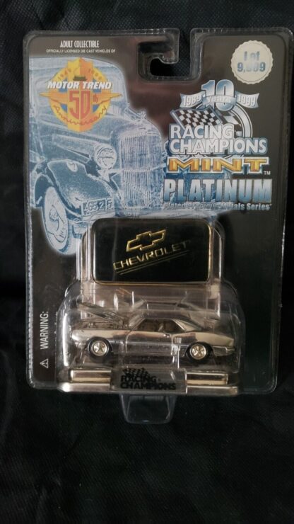 This Racing Champions’ 10 Year Anniversary Limited Edition (1 of 9,999) includes a detailed 3.25″ 1968 Pontiac Firebird HO Platinum Palladium Plated die-cast car body; HOWEVER, you’ll notice the MANUFACTURE ERROR of inadvertently placing a “Chevrolet” (not “Pontiac) emblem inside of the blister pack!