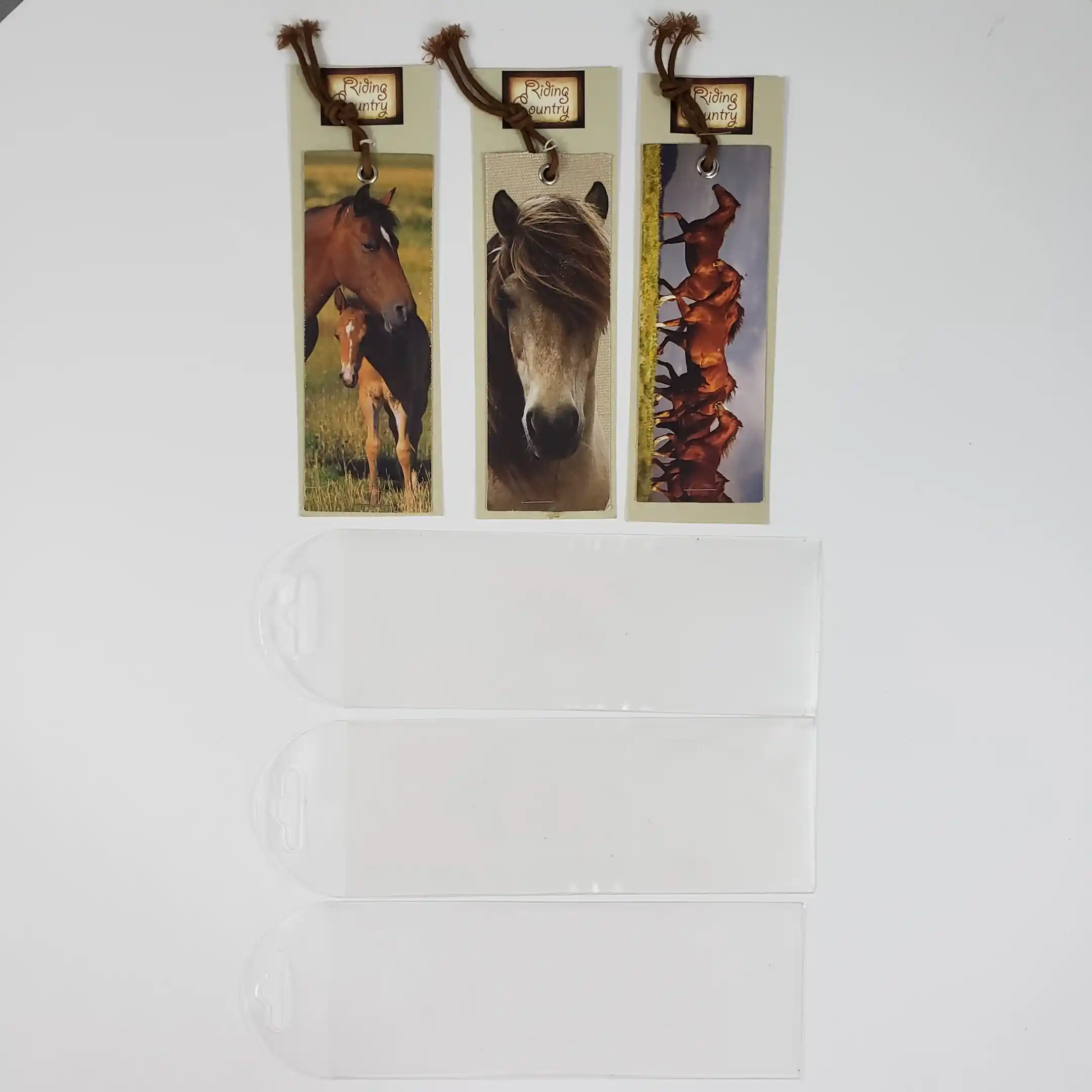 Bookmarks were never used and always stored in their clear plastic vinyl cases.  Bookmarks are still factory-attached to the cardboard backing.  The bookmarks are clean, odor-free.  The herd of horses bookmark has minor creasing at the top-half of the support-cardboard which does not affect usage of the actual faux-leather bookmark (as shown in photos).
